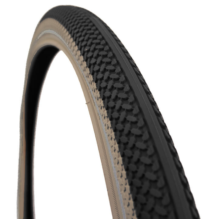 De klassieke brede bruin-crèmekleurige banden die worden gebruikt op de Cortina U4 transportfiets.